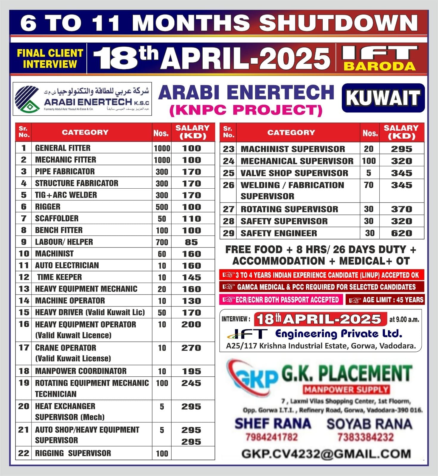 Are you a seasoned professional in the oil and gas industry looking to take your career to new heights? Kuwait is calling—and this could be your big break! Arabi Enertech, under the prestigious KNPC Project, is organizing a final client interview on April 18th, 2025, at 9:00 a.m. in Vadodara, India.